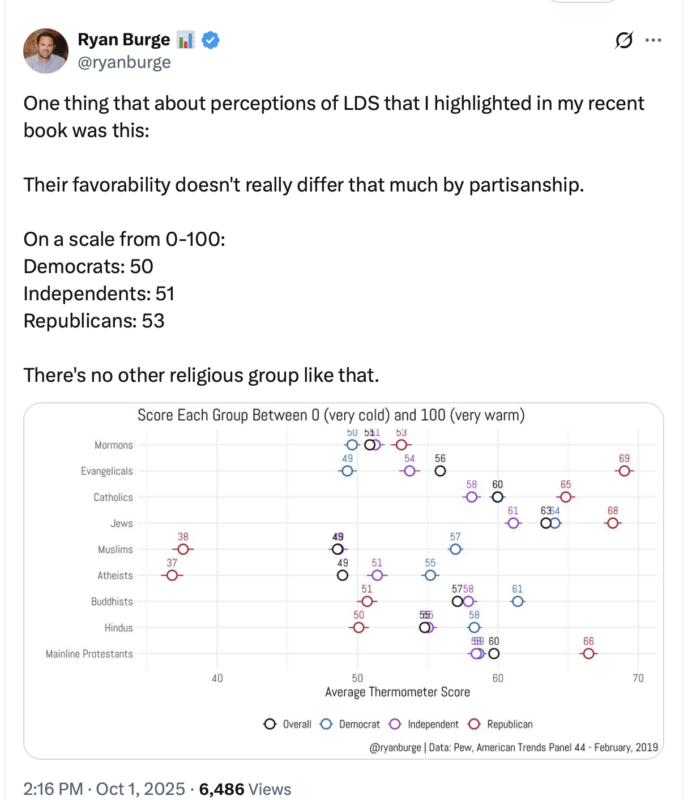And yes yes, the left could absolutely love us if we went full Episcopalian or Coc in terms of social issues theology and donated our 100 billion fund to worldwide anti-racist and anti-homophobia training seminars as a sort of indulgence for past racial and sexual sins. Unlike the right they couldn’t care less about us being non-trinitarians. And the right might like us more if we severely enervated our more exotic theologies, but being cool with either the left or the right isn’t worth much to me frankly in terms of messing with our teachings or operations. For the foreseeable future the Church of Jesus Christ will probably not really fit with both the left and the right, and I sometimes wonder if that is a feature and not a bug.